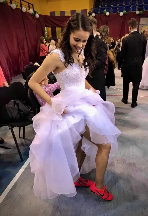 „Nagyon nehezen tudtam összeegyeztetni a táncpróbákat az edzésekkel, mivel iskola után az edzésekre rohanok, ezért a délutáni próbákról általában lemaradtam. Mivel semmiképp sem szerettem volna kimaradni a táncokból, ezért videók alapján próbáltam megtanulni a lépéseket. A párom, Dóka Gergő, szintén focista, így szerencsére jól tolerálta a hiányzásaimat. Bécsi keringőt táncoltunk és az osztállyal volt egy vicces koreográfiánk is” – mesélte el az mlsz.hu-nak Nagy Virág, az U19-es válogatott egyik alapembere a szalagavatójáról.