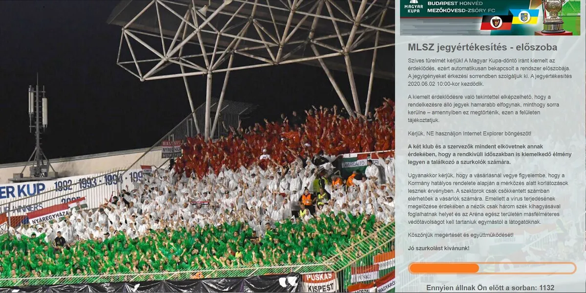 Csak a Magyar Kupa ma esti döntője előtti napon kezdte árulni az MLSZ a belépőjegyeket az új Puskás Aréna első tétmérkőzésére. A koronavírus-járvány okozta kényszerszünet után Európában először nálunk szökött föl a meccsláz: a szövetség internetes felületén nagy roham indult.