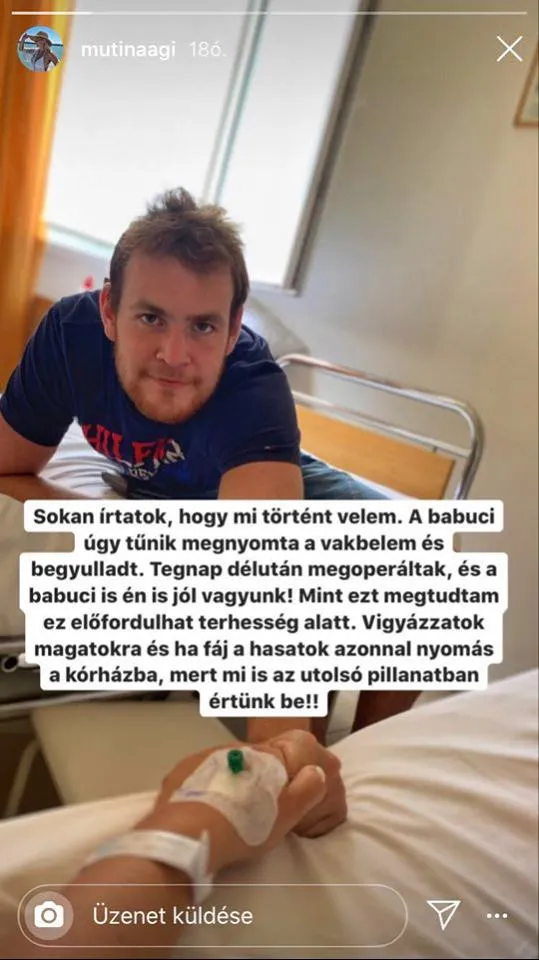 Mutina egy újabb fotóján már férje, Bernek Péter fogja a kezét, s itt a kismama el is mesélte, mi volt a baj. A baba megnyomta Ági vakbelét, az begyulladt, ezért meg kellett operálni. Szerencsére Mutina és a pici is jól vannak.