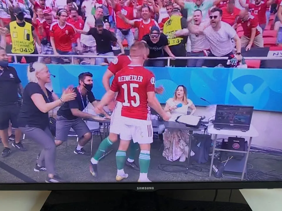Emlékezetes pillanat marad a magyar–francia meccsről a magyar játékosok önfeledt gólöröme is. A nemzetközi kézilabda-döntőkön és most az Eb hazai meccsein is szpíkerként, illetve hangulatfelelősként dolgozó, a pálya szegletében egy pad mögött ülő Szalay Editet ugyanis lerohanták Fioláék. A fiatal hölgy éppen lehajolt a füleséért, mert a nagy izgalomban véletlenül kihúzta azt a központi rendszerből, és mire felnézett, a futballistáink már ott őrjöngtek előtte, a gólszerző földöntúli boldogságában, nemes egyszerűséggel le is söpört mindent az asztaláról. Editnek végül sikerült felocsúdnia a sokkból, és ökölbe szorított kézzel ő is megünnepelte a gólt.