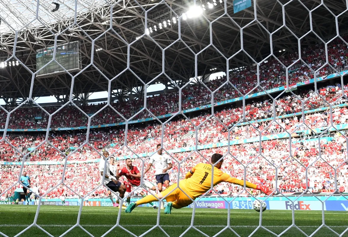 Fiola Attila (k) gólja a koronavírus-járvány miatt 2021-re halasztott 2020-as labdarúgó Európa-bajnokság F csoportjának második fordulójában játszott Magyarország – Franciaország mérkőzésen a Puskás Arénában 2021. június 19-én. A társházigazda magyar válogatott 1-1-es döntetlent játszott a világbajnok francia csapattal.