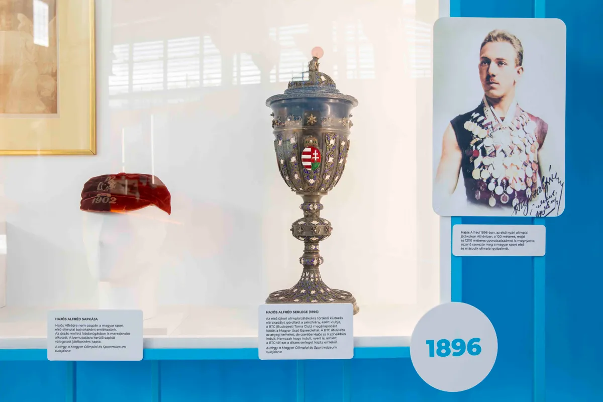 A kiállításra belépve először a Magyar delfinnek becézett Hajós Alfréddal „találkozunk”, aki az 1896. évi nyári olimpiai játékokon, az első újkori olimpián Athénban a 13°C-os tengervízben megrendezett versenyen megnyerte mind a 100 m-es , mind pedig az 1200 m-es gyorsúszószámot, ezzel ő szerezte a magyar sport első és második olimpiai győzelmét.