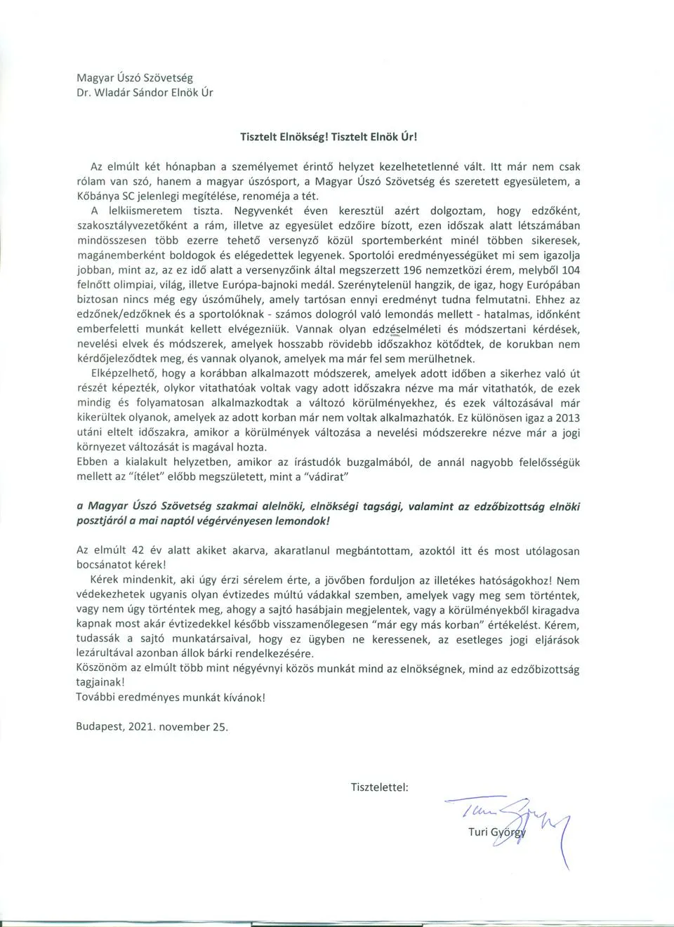 Nem várta meg a hivatalos ítéletet, 42 év után befejezte az úszósportban a munkáját Turi György. Az edzőt több korábbi versenyzője vádolta azzal, hogy pofozta, lelkileg terrorizálta, zaklatta őket. Turi szerint elképzelhető, hogy a korábban alkalmazott módszerek, amelyek az adott időben a sikerhez vezető út részét képezték, vitathatóak voltak, de folyamatosan alkalmazkodtak a változó körülményekhez.