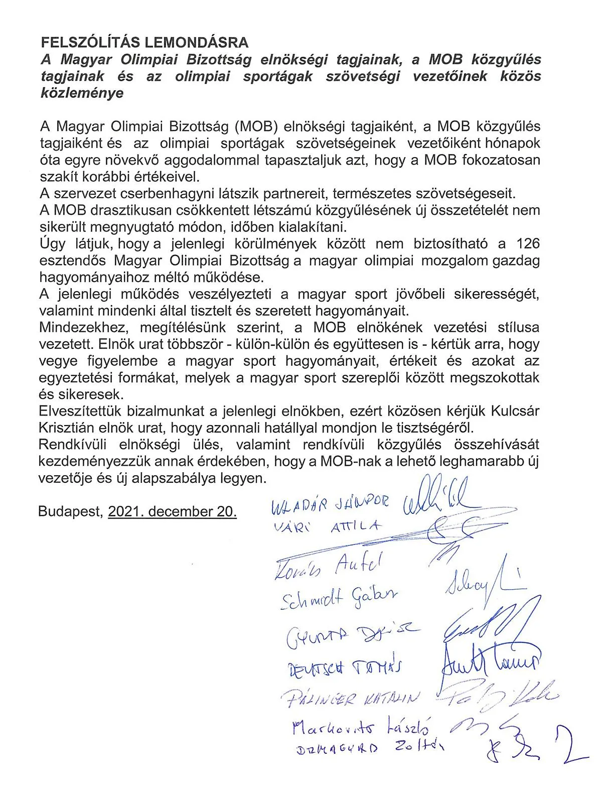A levél aláírói között öt olimpiai bajnok neve olvasható: Vári Attila, Kovács Antal, Magyar Zoltán, Wladár Sándor, Gyurta Dániel, de aláírta azt az elnökség egyetlen hölgy tagja, Pálinger Katalin, valamint a két alelnök, Deutsch Tamás és Schmidt Gábor is.