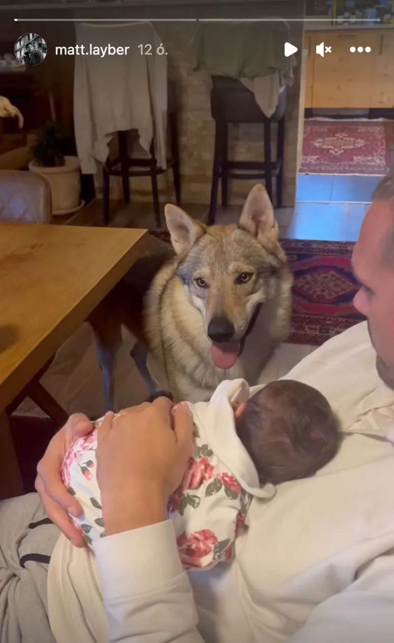Csakhogy akkor már legalább két napja otthon volt a család, hiszen Layber-Gelencsér Máté vasárnap az Instagramra töltött fel egy korlátozott ideig megtekinthető videót, amelyen az ölében tartott, valószínűleg pár nappal korábban megszületett kislányával ismerkedik az egyik kutyájuk.