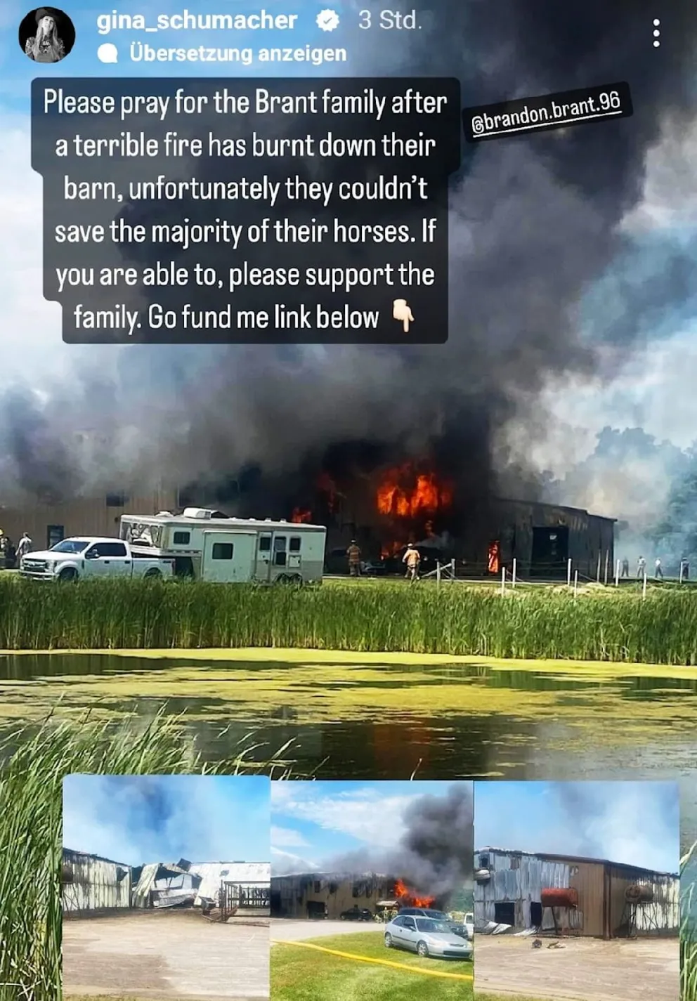 – Kérlek, imádkozzatok a Brant családért! Szörnyű tűzvész égette le az istállóikat, és tragikus módon nem tudták megmenteni a lovaik zömét – idézte Gina sorait a Bild.