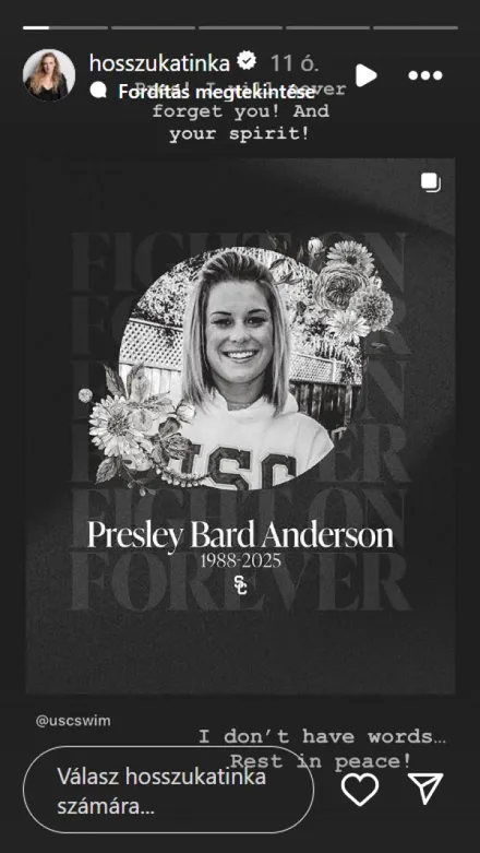 „Pres! Soha nem felejtelek el! És a lelked sem! Nem találok szavakat... Nyugodj békében!” – írta angolul, több közös kép kíséretében Hosszú Katinka Insta-sztoriban, miután arról értesült, hogy mindössze 37 éves korában elhunyt egykori dél-kaliforniai egyetemi úszótársa, Presley Bard Anderson.