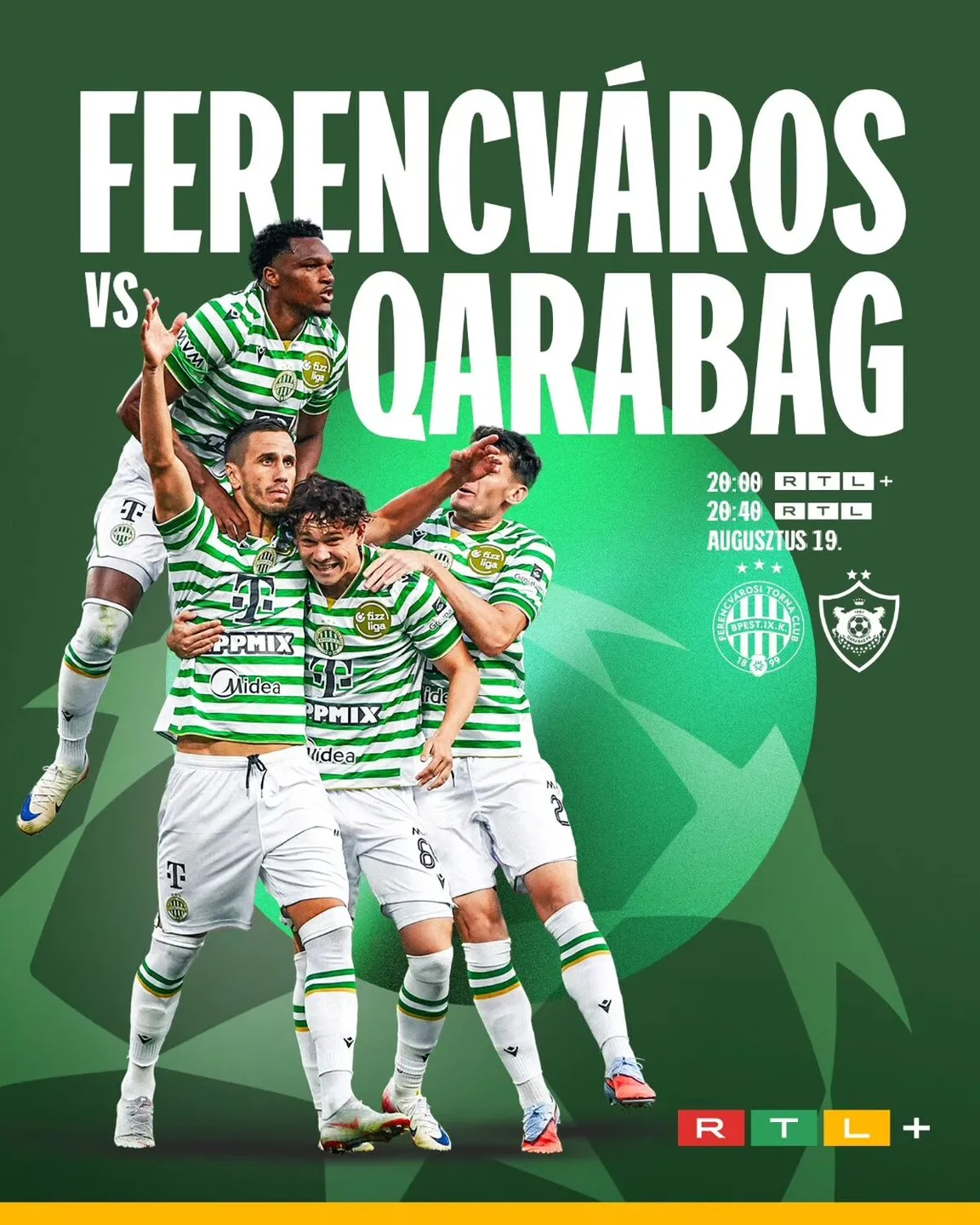 A Ferencváros jövő kedden, augusztus 19-én fogadja a Qarabagot a Bajnokok Ligája-selejtező rájátszásában. A Groupama Arénában 21 órakor kezdődő mérkőzést 20 órától felvezetéssel az RTL+-on, majd 20.40-től élőben az RTL főcsatornáján is láthatják a szurkolók
