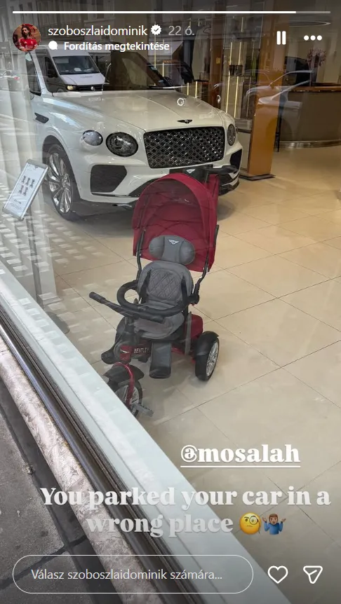 Szoboszlai Dominik a luxusmárkának számító Bentley egyik autókereskedésénél járt, amikor meglátott a kirakatban egy gyermekeknek kialakított triciklit. A magyar válogatott középpályás azonnal előkapta a telefonját, lefotózta a járgányt és a képet feltöltötte az Instagram-történetébe – majd jött a poén.
