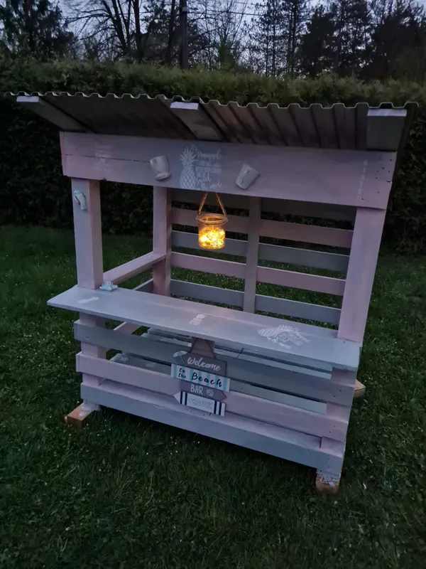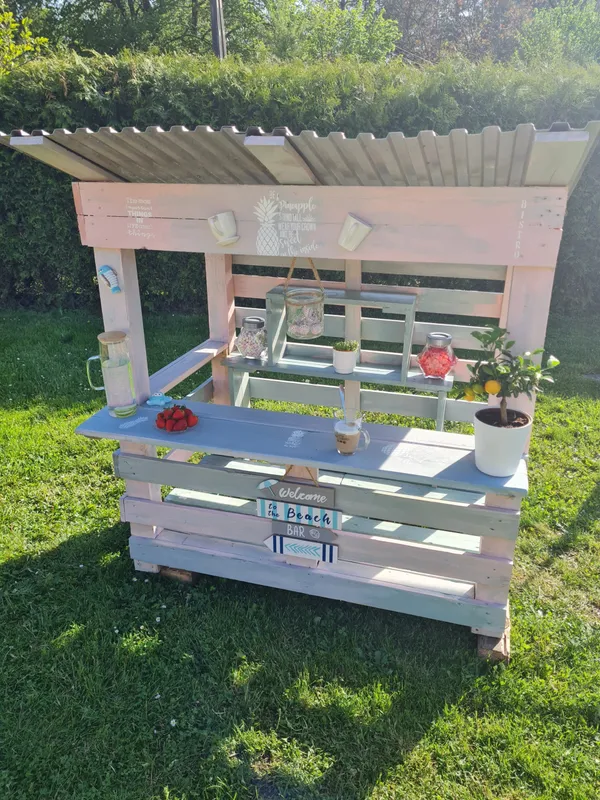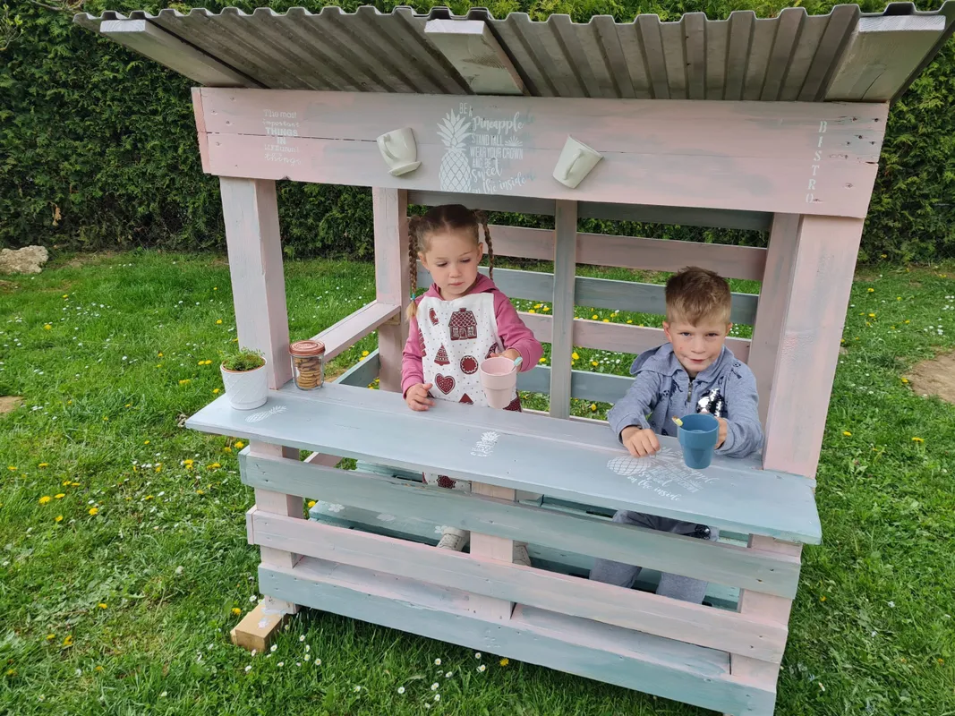 Raklapból rengeteg minden készülhet, tényleg csak a fantázia szab határt a lehetőségeknek: kerti pihenő, magaságyás, kerítés vagy virágtartó, sőt dekoratív strandbüfé is gyerekeknek. Kovács Tamara és férje sokáig gondolkodott, mit kezdjen az udvaron álló régi raklapokkal; aztán amikor a házaspár a neten rábukkant egy gyerekbüféről készült fotóra, elkezdődött a munka. A gyerekeik odáig voltak az ötletért!
