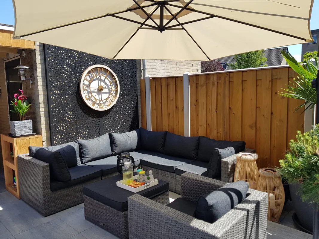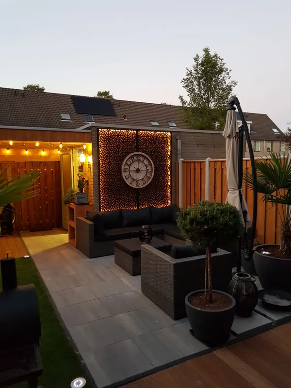 „Jani lefestette, kitalálta, hogy beleilleszti egy fakeretbe, majd rögzítette, sőt, még egy izzósort is tett a keret alá. Este csodás a hangulata!„ – áradozik férje ügyességéről Brigi, majd elárulja, hogy ő viszont egy nagyméretű faliórába szeretett bele, ami végül épp erre a dekorlapra került, az összhatás pedig fantasztikus! Az igazi fűről már a tervezés során letett a házaspár, mert egyértelmű volt, hogy a gyepnek nem sok esélye lenne a picike udvarban.