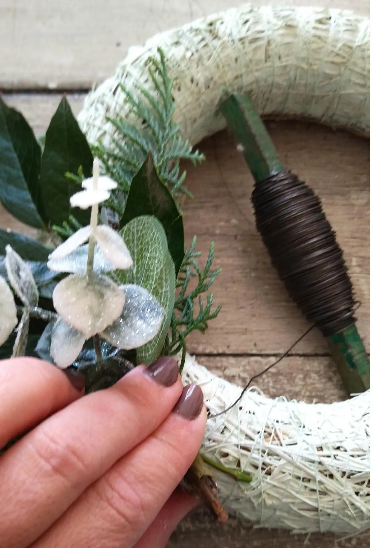 Fenyő, boróka, ciprus, borostyán – minél többféle örökzöld hajtásod van, annál csinosabb lesz a koszorúd! Ahhoz azonban, hogy mutatós legyen, mielőtt a koszorúalapra rögzíted őket, köss belőlük csokrokat. Minél több mini csokrot készítesz, annál könnyebb lesz a rögzítés. Ám mielőtt felteszed az örökzöldeket az alapra, határozd meg, hol lesznek a gyertyák, hiszen ehhez képest kell elhelyezz minden mást. A csokrokat dróttal erősítsd az alapra; jó szorosan tekerd, hogy masszív legyen. Az apró terméseket – makk, gesztenye, fenyőtoboz – ragasztópisztollyal rögzítsd a koszorúra.