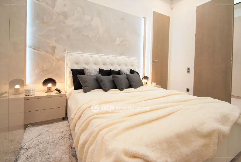 Felszereltség: - 3 rétegű üvegezés a 6 kamrás műanyag nyílászárókon (0,7K), - Motoros alumínium redőnyök, - Padló -és falfűtés Kondenzációs kazánnal, - Hűtő-fűtő klímarendszer Minden szobában, - Gépesített konyha, - Riasztó, Safe, - Ledes fő-és hangulatvilágítás rendszer, - Stand by kapcsoló rendszer, - HD Projektor, motoros vászon (12 nm) , -5.1.-es házimozi rendszer, Beépített Hangfalak, - Szauna, - Masszázs kád, - Teljes falfelület dryvit hálózva a repedések elkerülése érdekében, - Teljes falfelület tapétázva, - Teljes hangszigeteltség Blue Aqusto és Üveggyapottal, - Egyedileg gyártott fa ajtók, bútorok.