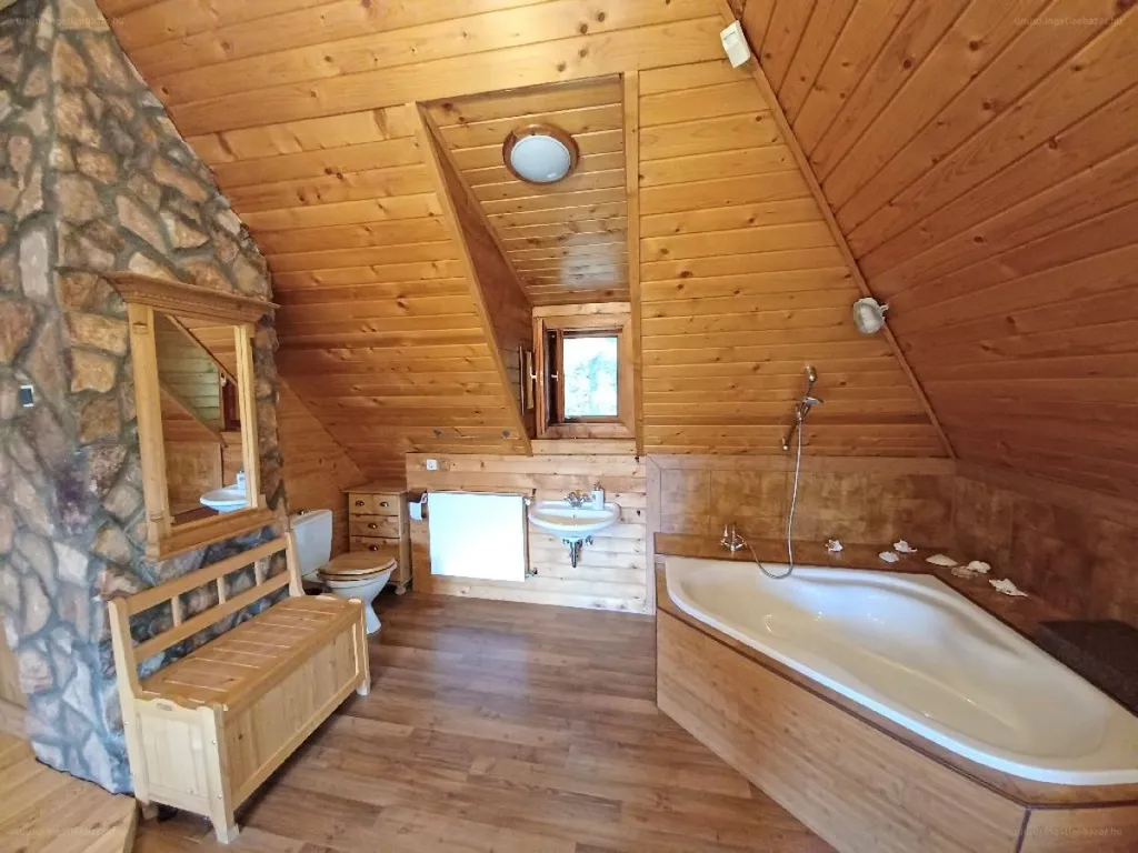 A tetőtér különleges, LOFT kialakítású egybetere a szabadság és kényelem érzését adja, melynek hatalmas ablakain át gyönyörködhetünk a festői táj szépségében, majd egy kellemes fürdőt vehetünk az egyedi kialakítású, nyitott fürdőtérben. A padlóburkolat a nappaliban és a szobákban hajópadló, a vizes blokkokban pedig kerámia, melyek mindegyike alatt természetes eredetű, agyag golyókkal történt a szigetelés, 10 cm vastagságban. Felszerelt klímák is rendelkezésre állnak, melyeknek szükségtelen a használata az épület kitűnő hőháztartásának köszönhetően. A villa védelméről távfelügyelettel ellátott riasztó gondoskodik.