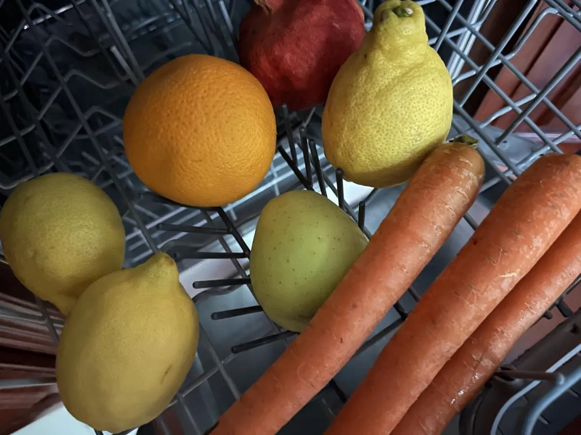 A mosásra szánt zöldségeket, gyümölcsöket pakold be a mosogatógépbe, tegyél a mosogatótabletta helyére egy evőkanál ecetet, majd hideg vizes rövid, áztató programmal indítsd el a gépet. A legszennyezettebb zöldségeket, gyümölcsöket érdemes a gép aljára pakolni. Ha lejárt a program, makulátlanul tiszták lesznek, és mehetnek a hűtőbe, vagy kezdődhet a feldolgozás – ahogyan ebben a videóban: