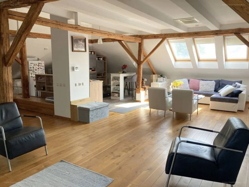 A felső szint amerikai stílusban megoldott stúdiólakás. Sajátossága, hogy egy légterű, vagyis nincs elválasztva egymástól a nappali, konyha, hálószoba, valamint a fürdőszoba csak részben szeparált.