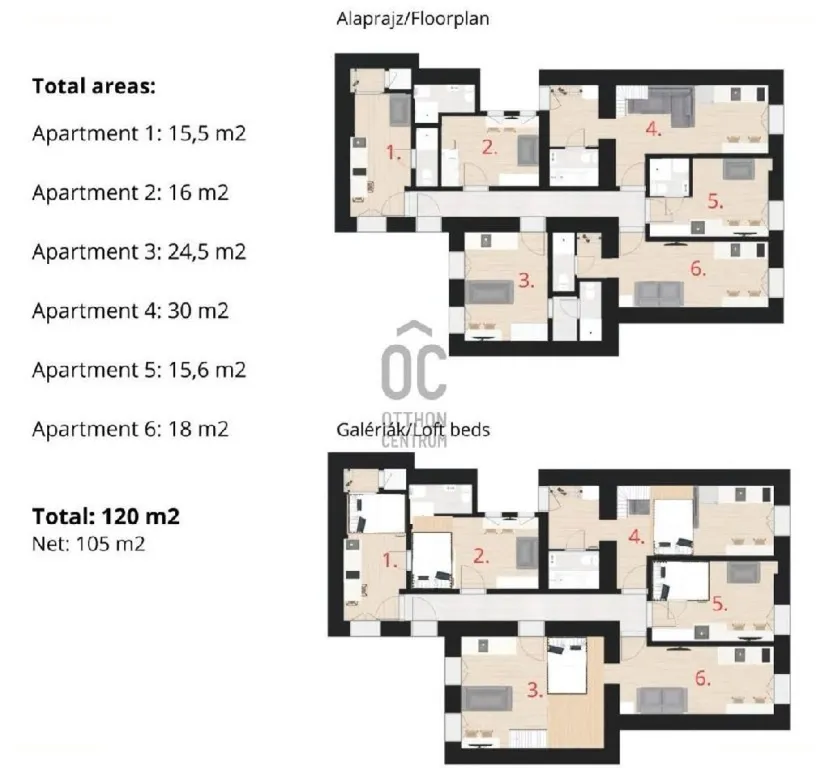 A 2020-ban kialakított ingatlanban hat összközműves, hosszútávon bérbe adott lakás található. Mindegyik különbejáratú, összkomfortos, galériázott és az új vevőnek nem is kell albérlők szerzésével bíbelődnie, most is valamennyi lakásnak van lakója. Sőt, megegyezés esetén a jelenlegi tulajdonos még a további üzemeltetést is bevállalja.