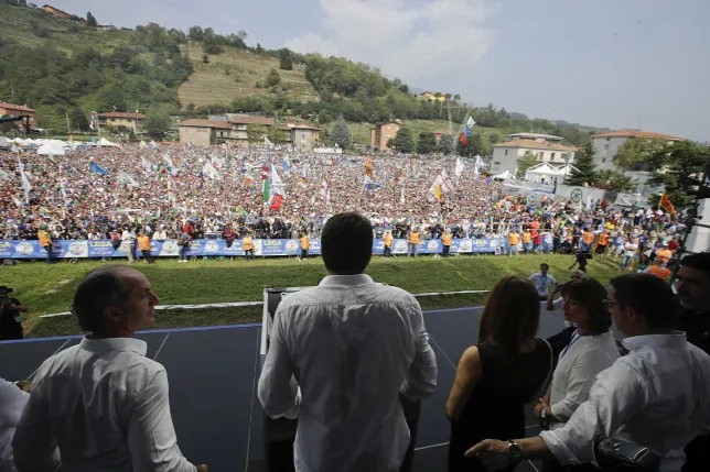 A Liga vezérének szavait több tízezren hallgatták Pontida mezején, az egykori Északi Liga megalakulásának jelképes helyszínén, ahol a párt 1990-től minden évben nagygyűlését tartja.