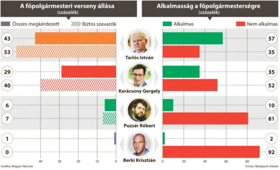A felmérés szerint a budapesti választók mindössze 40 százaléka tervezi Karácsony Gergely – a baloldali ellenzék főpolgármester-jelöltje – támogatását, hét százalékuk pedig az „ellenzék ellenzékére”, Puzsér Róbertre szavazna. Tarlós István a városvezetési alkalmasság szempontjából is jócskán megelőzi kihívóit, hiszen arra a kérdésre, hogy az adott személy alkalmas-e arra, hogy Budapest főpolgármestere legyen, a megkérdezettek 57 százaléka válaszolt igennel a jelenlegi főpolgármester esetében, s csak 35 százalékuk gondolta így Karácsony, 10 százalékuk pedig Puzsér esetében.