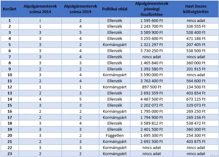 A költségeket tekintve, figyelembe véve, hogy három kerület esetében még nem elérhetőek ezek az adatok 48 340 410 Ft-ot keresnek az alpolgármesterek összesen, ami mellé 6 877 646 Ft-nyi költségtérítés jár.