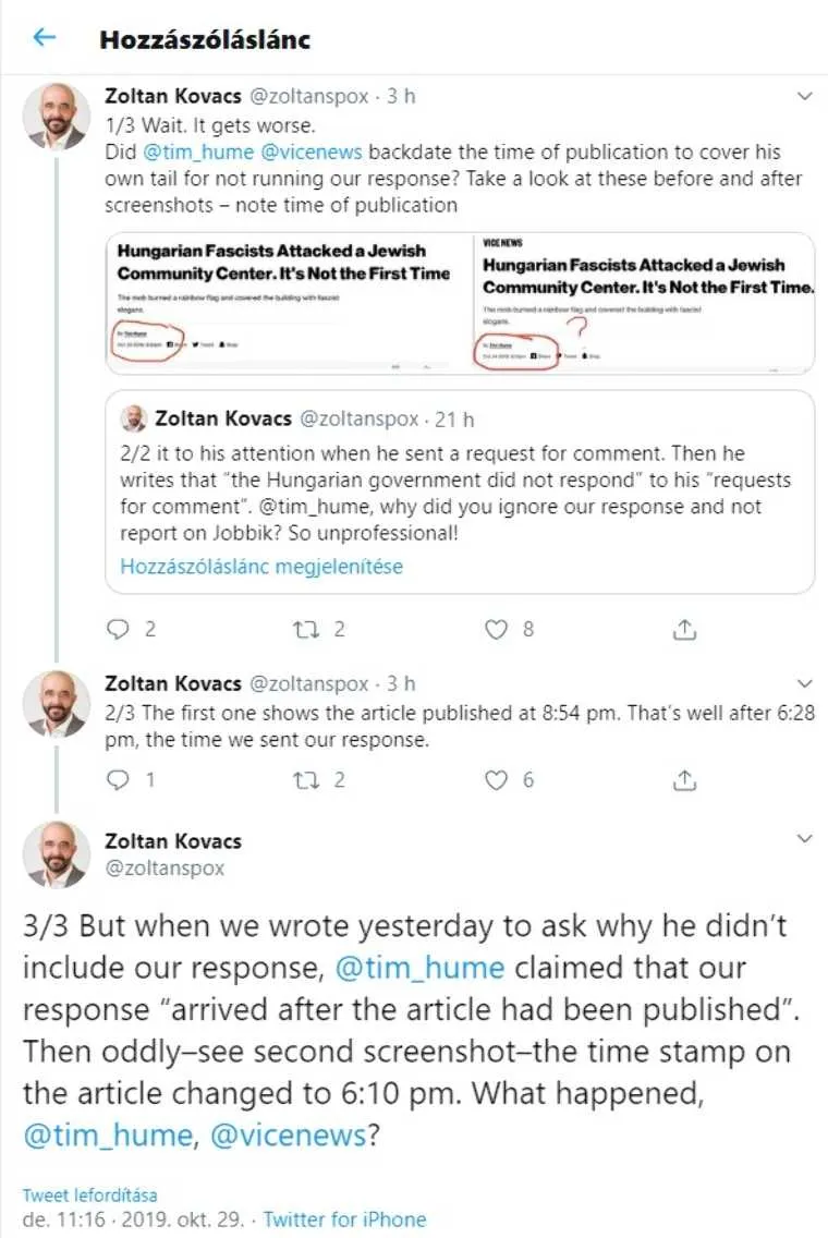 A magyar kormány részéről Kovács Zoltán ezt cáfolta és számonkérte a szerzőn, miért nem építette be megküldött reakcióját a cikkbe, mire Tim Hume – az államtitkár másik tweetje szerint – azt válaszolta, hogy az a cikk megjelenése után érkezett. Csakhogy Kovács két képernyőképpel bizonyította, hogy a cikket mindeközben visszadátumozták, a politikus megfogalmazása szerint azért, hogy ne kelljen figyelembe venni a kormányzati választ és továbbra is fennállhasson a magyar kormányzat elleni hamis vád, anélkül, hogy a szélsőjobboldali szervezethez valójában kötődő, de immáron a Soros-hálózat érdekeit kiszolgáló baloldali ellenzékhez csatlakozott Jobbikot belekevernék az ügybe.