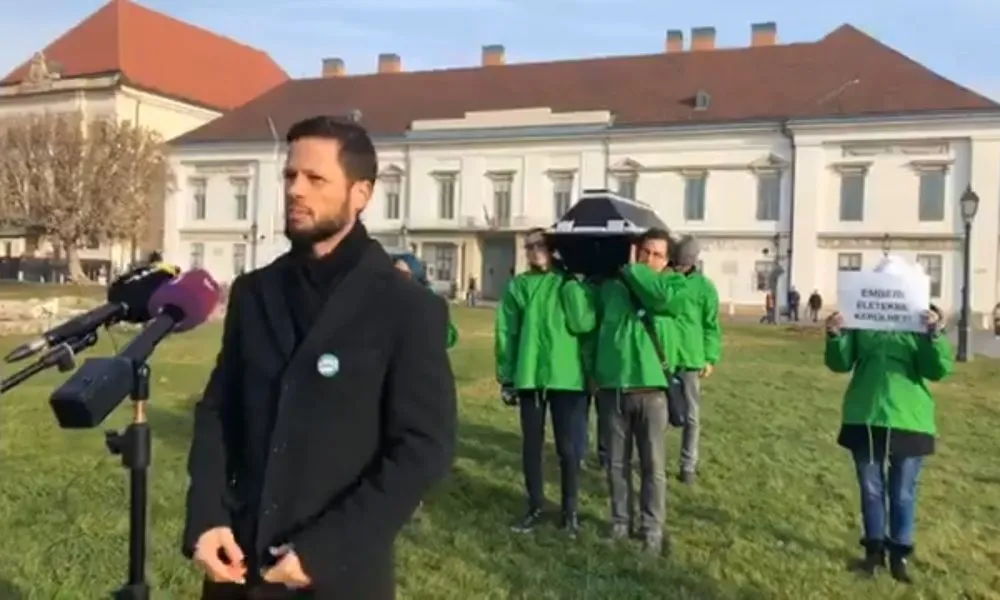 Azért hoztunk ide a Párbeszéd aktivistáival egy koporsót a köztársasági elnök palotája elé, mert a társadalombiztosítási ellátás szigorításáról szóló törvény konkrétan emberéletekbe kerülhet – fogalmazott Tordai Bence.