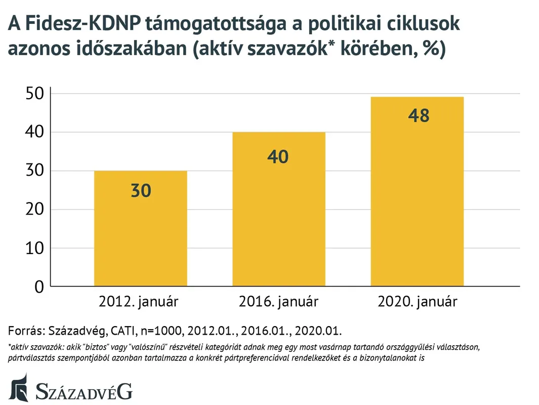 A Századvég friss elemzése szerint azonban, e tendencia ellenére, a FIDESZ-KDNP támogatottsága erősebbé vált az egyes kormányciklusok félidején. A politikailag aktív választók körében a három releváns politikai ciklus azonos időszakait összevetve a jelenlegi ciklusban a legmagasabb a kormánypártok támogatottsága: míg 2012 januárjában az aktív (választáson részt venni szándékozó) szavazók 30 és 2016 szóban forgó időszakában a 40 százaléka, addig idén januárban a 48 százalékuk támogatta a FIDESZ-KDNP szövetséget.