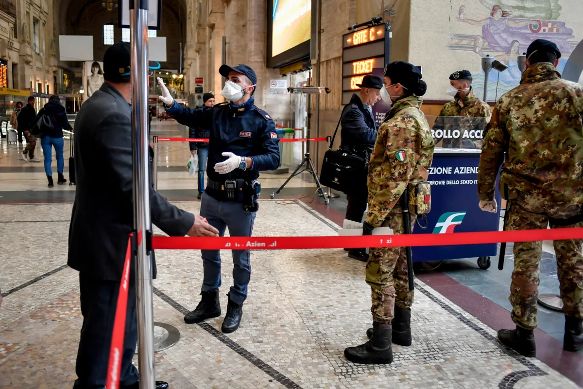 Rendõrök és katonák a Milánóból távozni kívánó utasokat ellenõrzik Lombardia tartomány székhelyének központi pályaudvarán 2020. március 9-én.