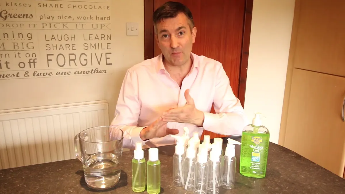 A férfi a kézi fertőtlenítő előállításához 3 liter bort és szájvizet használ, hogy desztillációval olyan szeszt kapjon, amely körülbelül 65 százalékos erősségű. A műveletet megismétli, a végeredményt pedig összekeveri aloe vera géllel. A biztonság kedvéért méri az elegy alkoholtartalmát: a kész gél 70 százalék alkoholt tartalmaz az aloe vera hozzáadása után. Ezután már csak palackoznia kell.