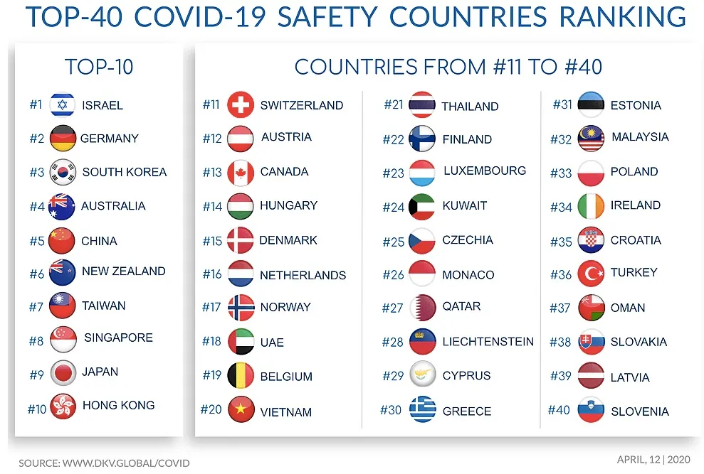 Az egyebek mellet tudományos kutatásokkal is foglalkozó London Deep Knowledge Group közzétett egy ranglistát arról, hogy melyik negyven ország lakosai érezhetik magukat a leginkább biztonságban, hol a legstabilabb a helyzet, azaz melyik kormány milyen hatékonyan kezeli a koronavírus-járvány egészségügyi oldalát.