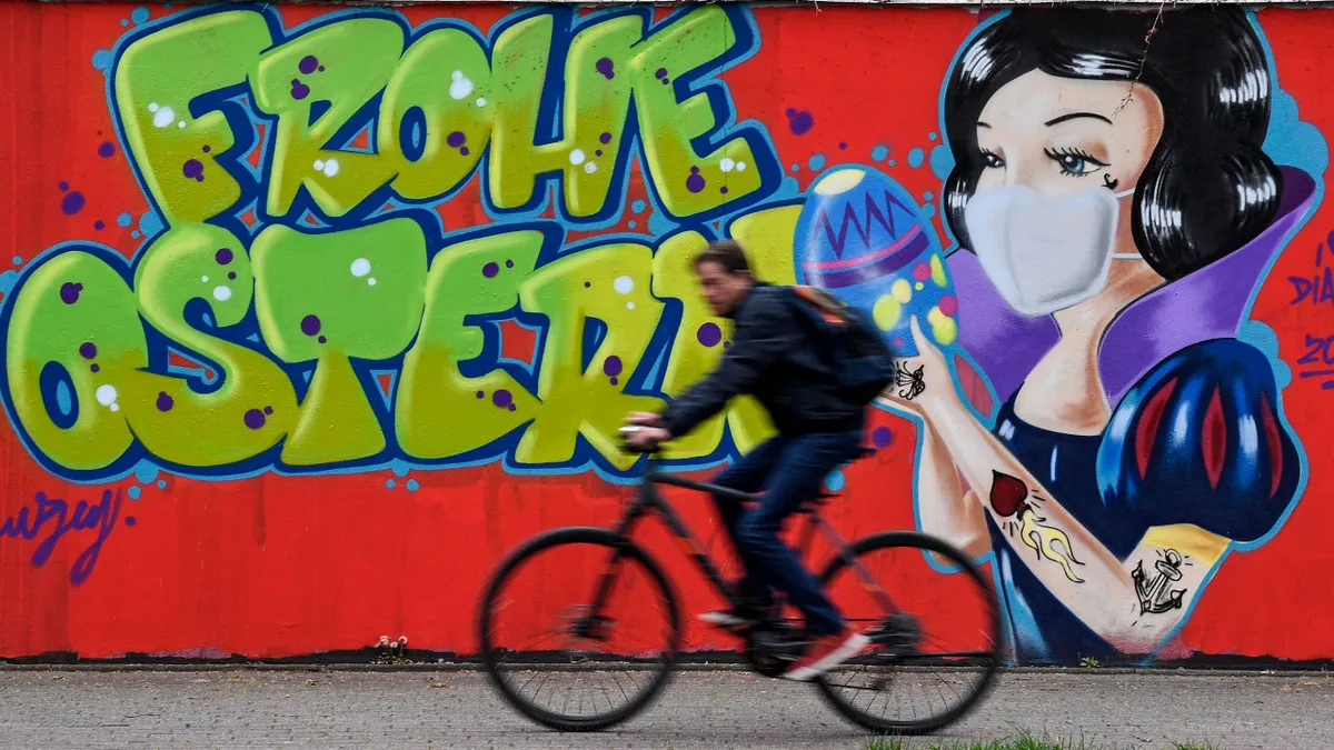 Kerékpáros halad el egy Boldog Húsvéti Ünnepeket jelentésű falfelirat előtt a koronavírus-járvány idején a németországi Hamm városában 2020. április 13-án.