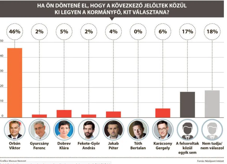 A miniszterelnök a magyarok 46 százalékának támogatását maga mögött tudva az összes lehetséges ellenzéki kormányfőjelöltnél együttvéve is népszerűbb.
