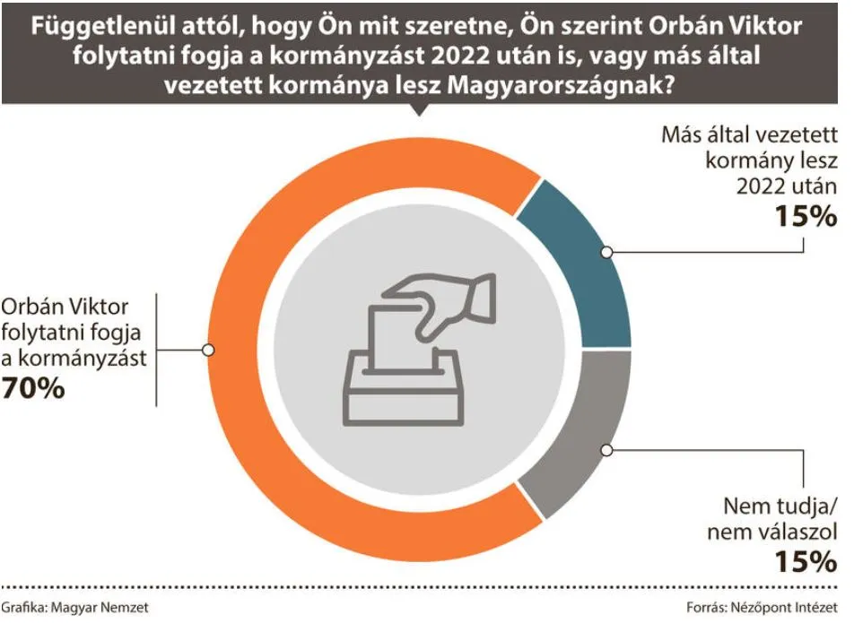 A Nézőpont Intézet Magyar Nemzet számára készített összeállítása szerint a megkérdezettek 70 százaléka úgy véli, hogy Orbán Viktor 2022 után is folytatni fogja a kormányzást.