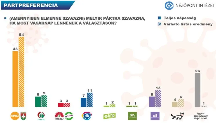 A Fidesz-KDNP országos listájára a biztos szavazók 54 százaléka voksolna, egy most vasárnapi választás esetén. Az ellenzéki összefogáshoz tartozó pártokra 16 százalékponttal kevesebben, mindössze a részvételüket biztosra ígérő polgárok 38 százaléka – derül ki a Nézőpont Intézet reprezentatív közvélemény-kutatásából.