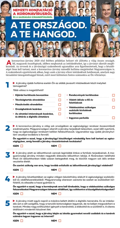 Farkas Örs, a Kormányzati Tájékoztatási Központ szóvivője az M1 aktuális csatorna június 8-ai műsorában elmondta: a koronavírusról és a gazdaság újraindításának intézkedéseiről kezdeményezett nemzeti konzultáció kérdései révén egyebek mellett a családok ingyenes internet-használatáról, egy állandó magyar járványügyi szolgálatról és a hazai turizmus népszerűsítéséről kérik ki az emberek véleményét. Kitért arra is, hogy az elmúlt időszakban született az Európai Unióban néhány olyan ítélet, amely Magyarországot elmarasztalta migrációs politikája miatt, ezért az utolsó két kérdés erre vonatkozik.