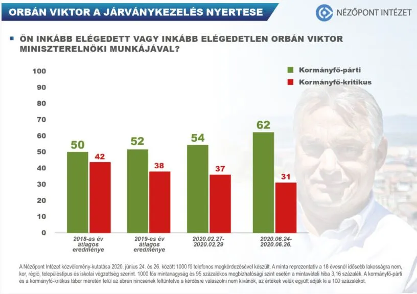 Egyértelműen növekedett az Orbán Viktor munkájával elégedettek aránya a koronavírus-járvány kezelésének következtében; jelenleg a magyar társadalom 62 százaléka elégedett a miniszterelnöki munkájával – közölte legfrissebb – ezer ember megkérdezésével készített – közvélemény-kutatása eredményét a Nézőpont Intézet az MTI-vel.