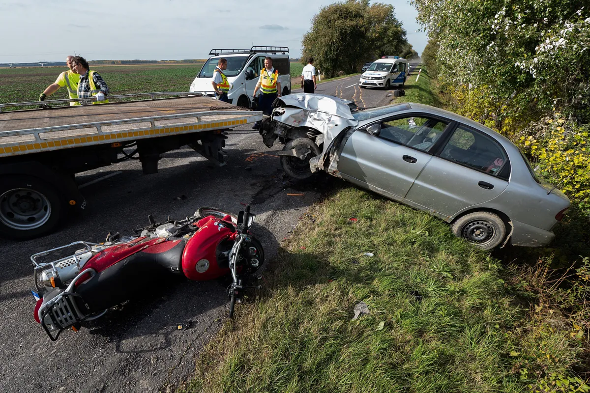 Összeroncsolódott személyautó és motorkerékpár mellett helyszínelnek rendõrök az 51-es fõút 140-es kilométerénél, Dusnok közelében 2020. október 23-án, miután az autó összeütközött két motorkerékpárral. A két motoros a helyszínen meghalt.