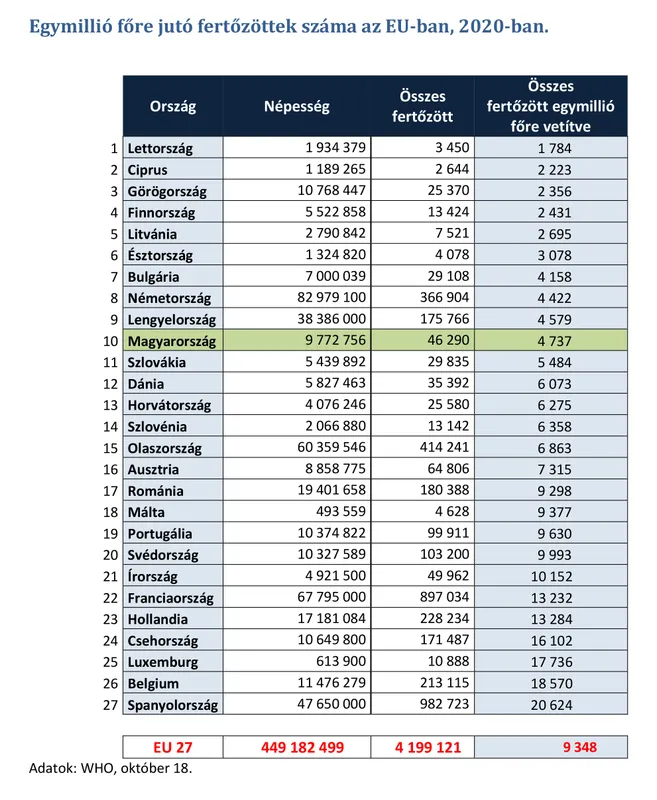A WHO adatai szerint a járvány egészét tekintve Magyarországon mintegy a fele az egymillió főre vetített fertőzöttek száma az EU-s átlagnak, amivel egyértelműen a jobban teljesítő országok közé tartozunk.