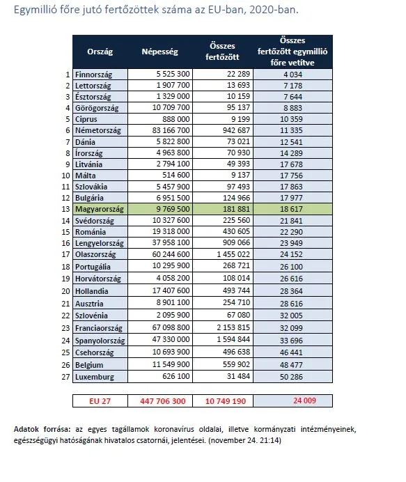 Az EU 27 országát tekintve az új fertőzöttek száma 17 országban csökkent az elmúlt héten, ebből Magyarországon az 5. legnagyobb mértékben. Magyarország az egymillió főre jutó fertőzöttek számát tekintve is jól áll, a nyugat-európai országok adatai viszont egyre rosszabbak, Franciaországban például kétszer akkora a teljes fertőzöttség, mint hazánkban.