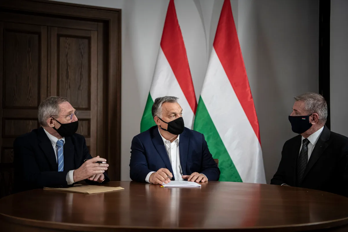 A Miniszterelnöki Sajtóiroda által közreadott képen Orbán Viktor miniszterelnök (k) Pintér Sándor belügyminiszterrel (b) és Benkő Tibor honvédelmi miniszterrel egyeztet a Karmelita kolostorban 2020. november 11-én.