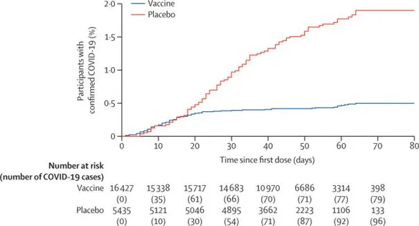 A vizsgálatot 18 év feletti felnőtteken végezték, minden esetben kizárták az előzetes fertőzést. Összesen 16 501 ember kapott vakcinakészítményt és 5476 ember placebót. 60 év feletti alanyokból összesen 1611 vakcinált és további 533 placebocsoportba tartozó egyént vizsgáltak és elemeztek. A hatékonyság tekintetében a vizsgálat 91,6%-ot állapított meg. A vakcináltak körében a neutralizáló antitestek megjelenése 98%-ban volt megfigyelhető 42 nappal a vakcinálás megkezdését követően. A vakcina az első dózist követően 15 nappal mutat mérhető védelmet. 15 és 21 nap között a hatékonyság 73,6%-ban állapítható meg, a második dózist követően pedig 100%-nak közlik.