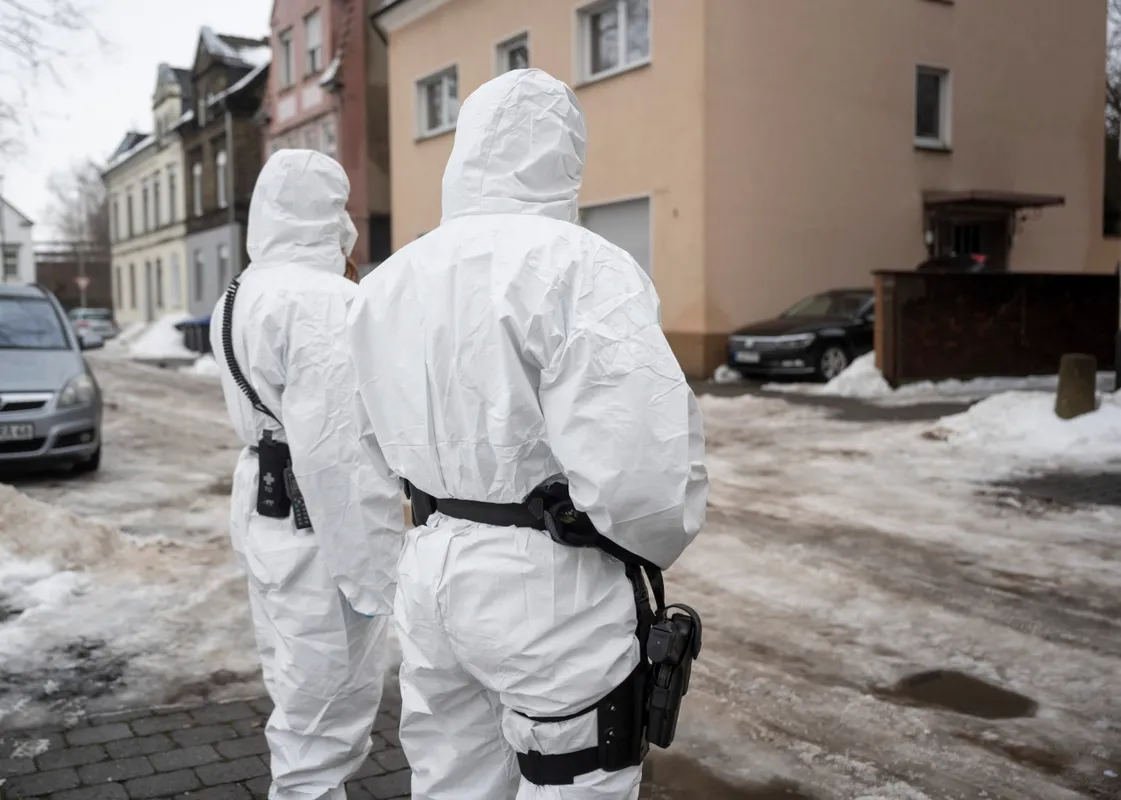 Vesztegzár alá helyezett épületeket őriznek rendőrök a nyugat-németországi Hammban 2021. február 16-án, miután az egyik házban lakó építőmunkásnál kimutatták az új koronavírus brit változatát.