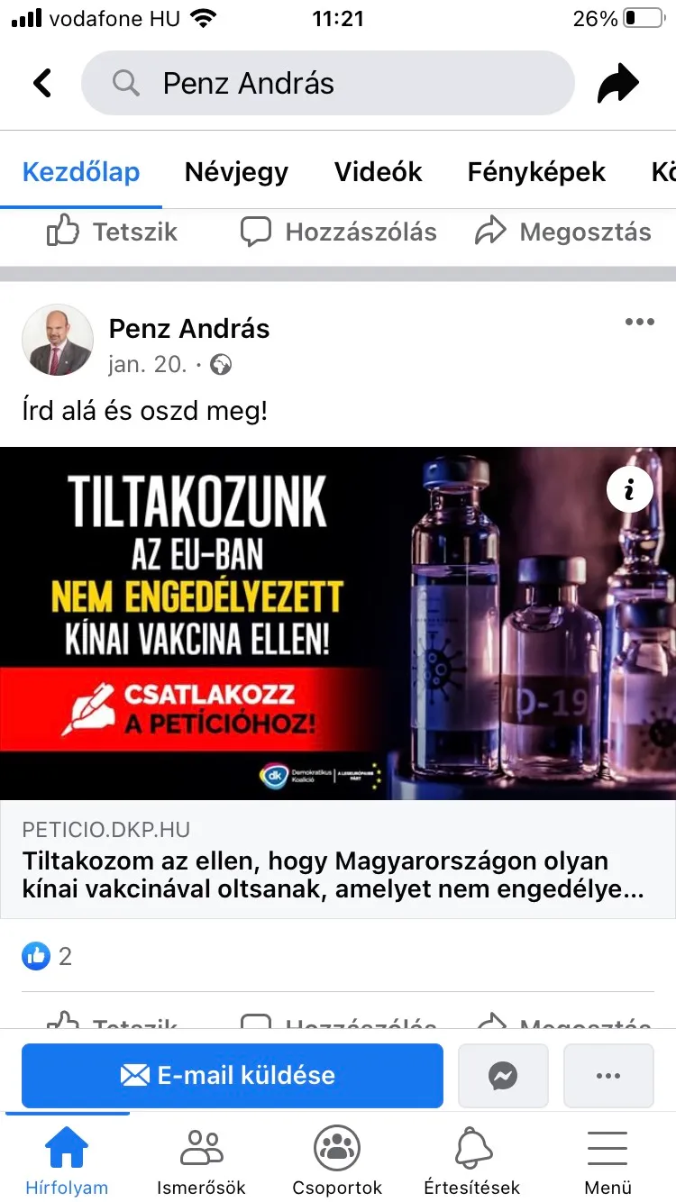 Ennek azért van jelentősége, mert sajtóhírek szerint Penz András februárban visszautasította a kínai vakcinát, pedig lehetősége lett volna az oltásra. Ahogy beszámoltunk róla, a politikus követve pártja kommunikációs irányvonalát, közösségi oldalán több oltásellenes tartalmat is közzétett. Januárban megosztotta a DK kínai vakcina alkalmazása ellen indított petícióját, annak aláírására buzdítva ismerőseit. Februári bejegyzésében is azt sugalmazta, hogy gond lehet a keleti vakcinákkal, majd ismételten az oltásellenes petíciót népszerűsítette.