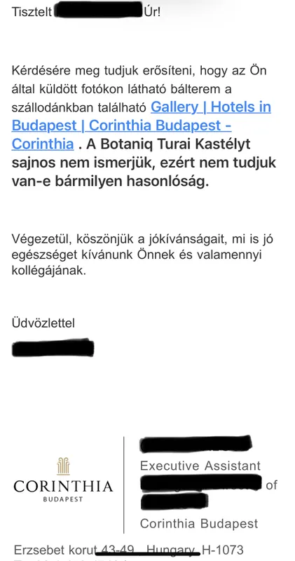 „ Kérdésére meg tudjuk erősíteni, hogy az Ön által küldött fotókon látható bálterem a szállodánkban található.”