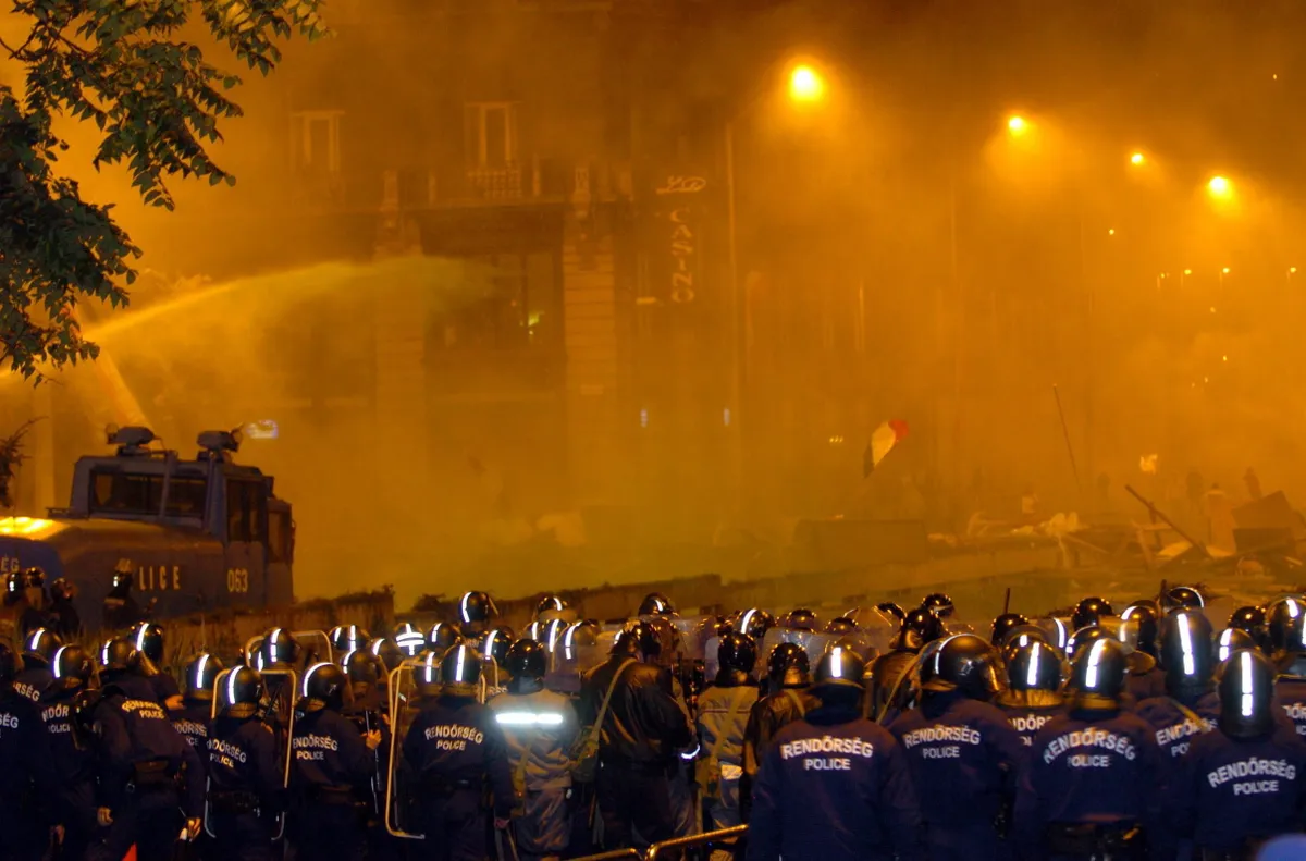 Rendõrök vízágyúval oszlatják a tömeget a Ferenciek terén.