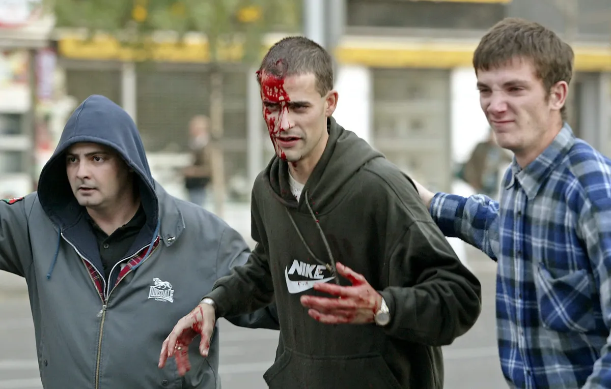 Tüntetõk vérzõ fejû társukat kísérik a Károly körúton. Folytatódtak az összecsapások a tüntetõk és a rendõrök között az 1956-os forradalom és szabadságharc 50. évfordulóján.