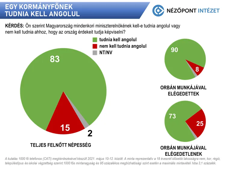 A teljes felnőtt népesség 83 százaléka várja el, hogy a magyar miniszterelnök tudjon angolul ahhoz, hogy „az ország érdekeit tudja képviselni”, s csak a megkérdezettek 15 százaléka gondolja úgy, hogy ez nem szükséges.