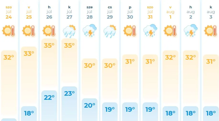Nyugat felől gyakran növekszik meg a gomolyfelhőzet, de inkább csak északon és nyugaton fordulhat elő frissítő zivatar, zápor. A déli, délkeleti szél többfelé lesz erős, zivatarok környezetében viharos. 30-35 fokos, országos hőség valószínű.