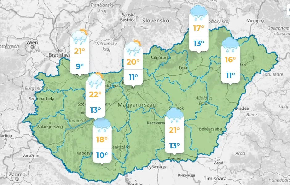 Vasárnap a nap első felében keleten még több helyen lehet kiadós eső, zápor, zivatar; majd szakadozik a felhőzet, és elszórtan fordulnak elő záporok. Élénk, néhol erős lesz az északnyugati szél. 15-22 fok közötti értékeket mérhetünk mindössze.