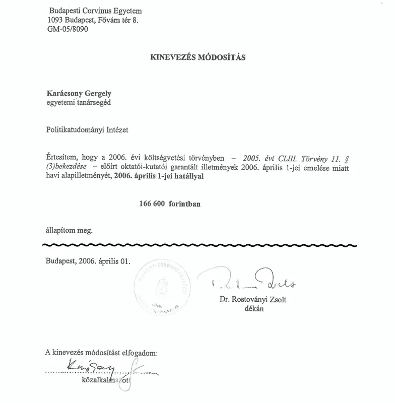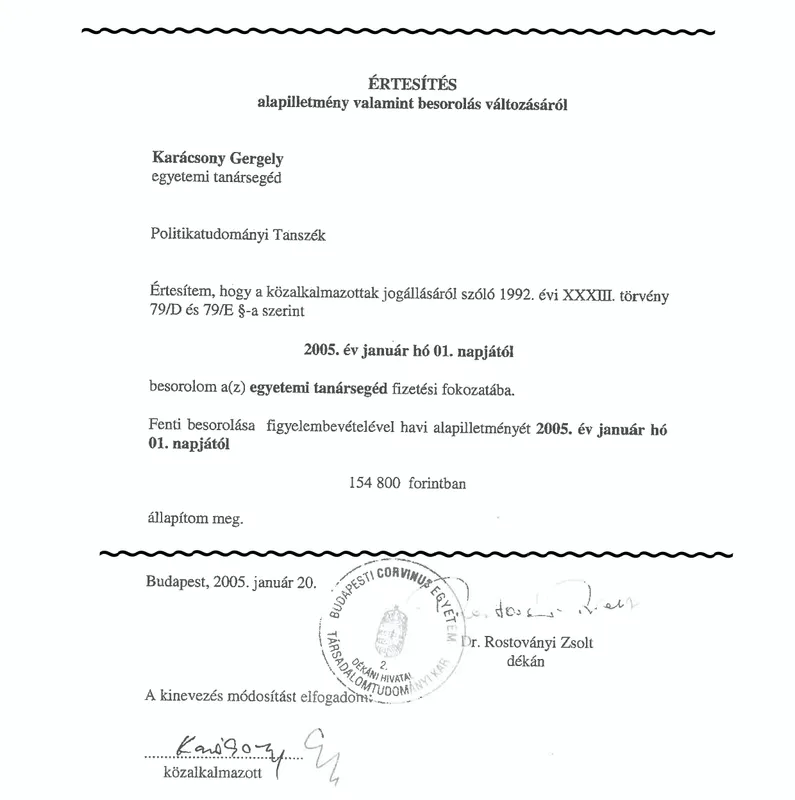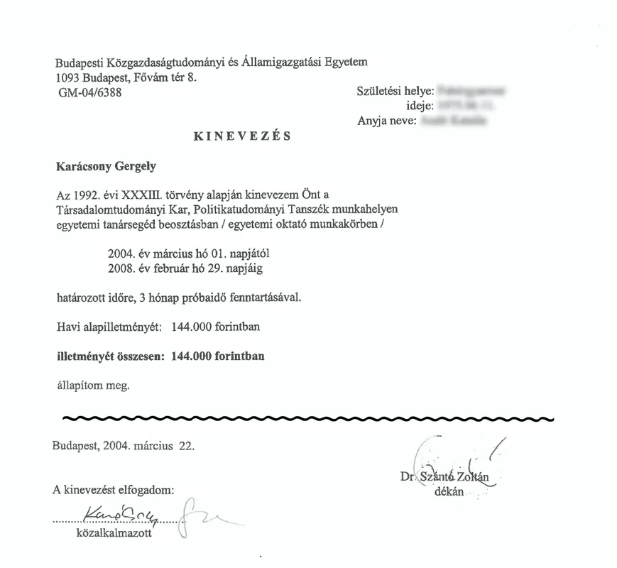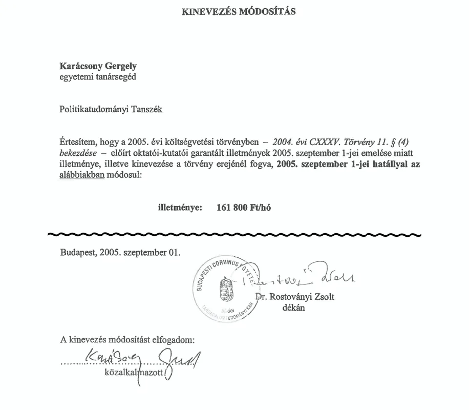 Karácsony azt mondta: nagyjából százezer forintot keresett havonta egyetemi oktaóként. Most ez a kérdés is tisztázódott, a kinevezési okiratokon egyértelműen szerepelnek az adott időszakra vonatkozó illetmény összegek.